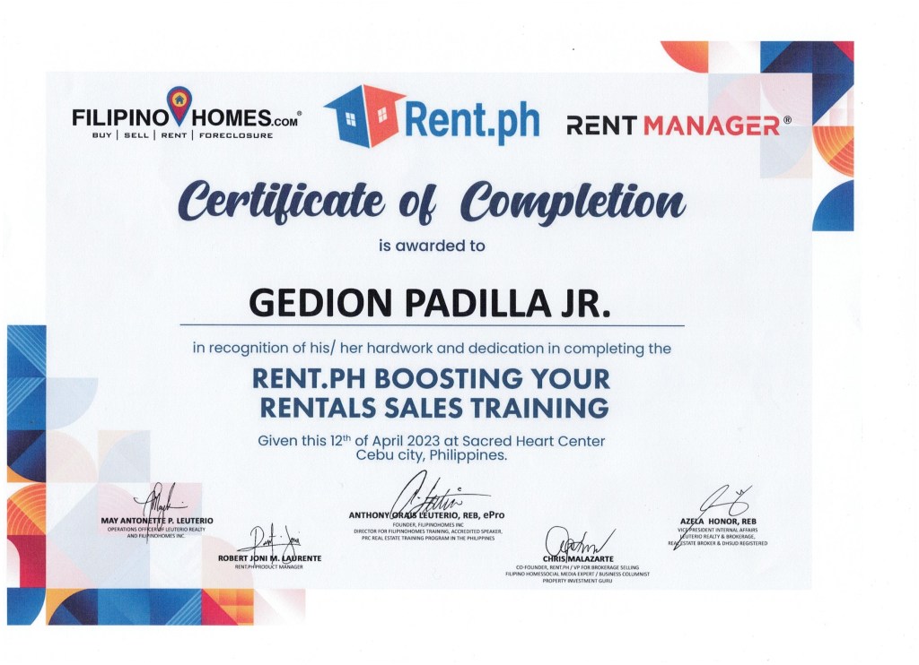 If you have properties like house, office space, warehouse or condominium units that you are planning to be rented out within these key cities: Talisay, Cebu, Mandaue, Lapu-lapu and neighboring municipalities, don’t hesitate to contact Gedion Padilla Jr. at 09062428575 and he’ll be happy to assist you.