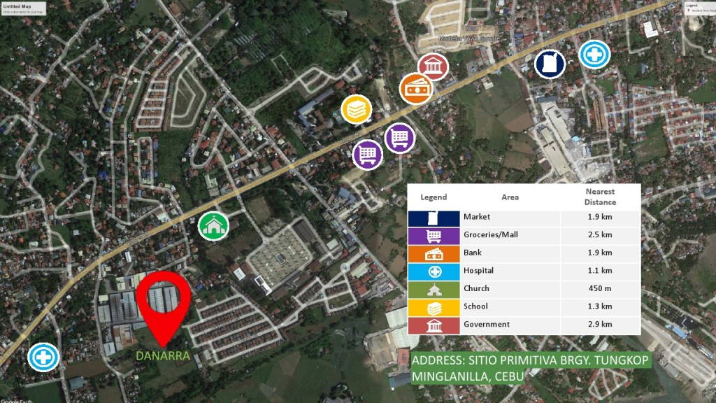 Danarra South is conveniently located approximately 50 meters from the highway, offering both accessibility and tranquility. It’s a 5-minute drive to Gaisano Grand Minglanilla, 9 minutes to Robinsons Supermarket, and 3 minutes to Cebu South General Hospital.