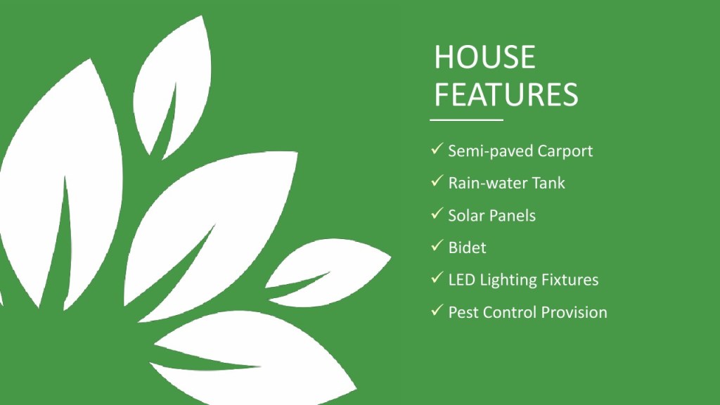 Each house is equipped with a hybrid solar panel to provide energy savings and ensure lighting during power outages. The development also features solar streetlights and rainwater catchments, promoting an eco-friendly lifestyle.