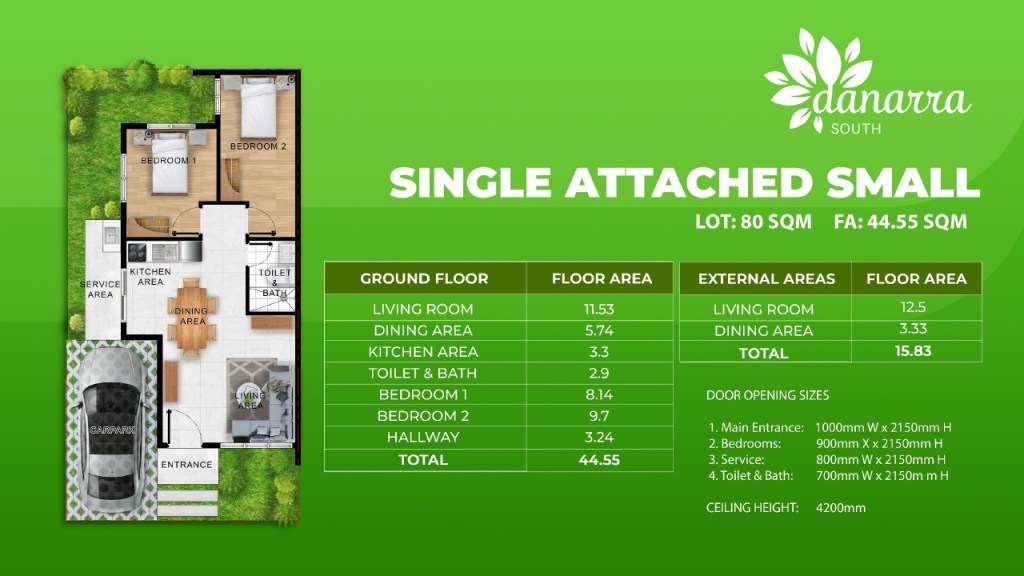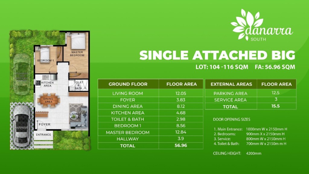- Odessa (Single Attached Small): Single-storey with 2 bedrooms, living and dining area, kitchen, toilet and bath, and a carport accommodating up to 2 vehicles. Lot area: 104-129 sqm; Floor area: 56.96 sqm.