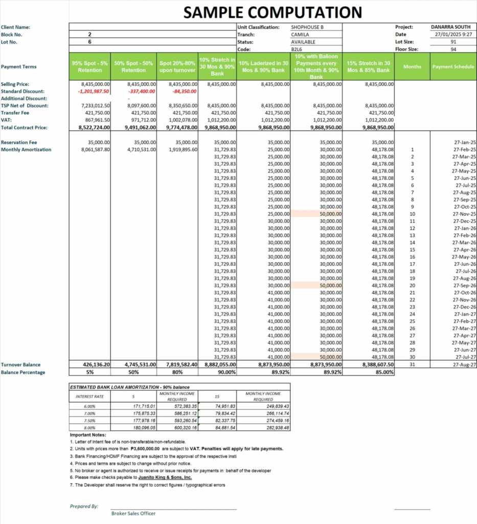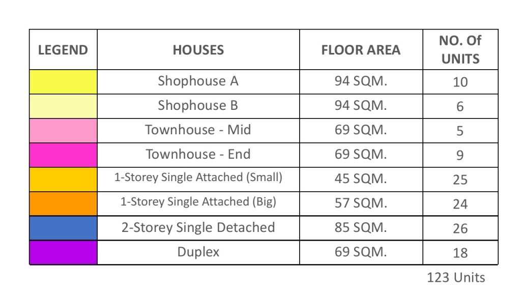- Camila (Shophouse B ): Two-storey with 2 bedrooms, 1 toilet and bath, living and dining area, kitchen, a provision for an additional toilet and bath, and 2 parking slots. Lot area: 91-114 sqm; Floor area: 94.23 sqm.