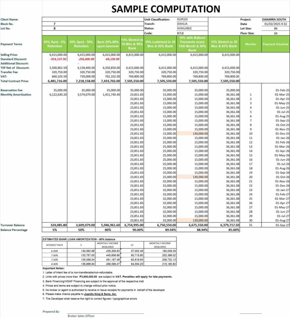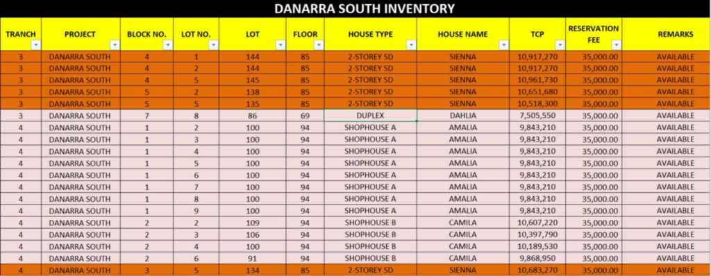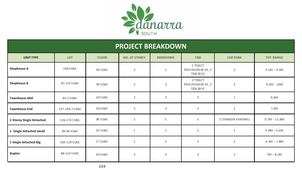 - Dahlia (Duplex): Two-storey with 3 bedrooms, 3 toilets and baths, living and dining area, kitchen, balcony, and 2 parking slots. Lot area: 86-114 sqm; Floor area: 68.60 sqm.