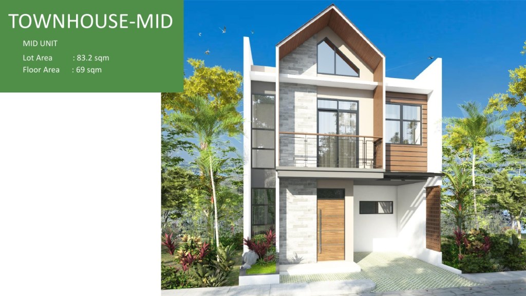 - Sabina (Townhouse Mid): Two-storey with 3 bedrooms, 3 toilets and baths, living and dining area, kitchen, balcony, and a parking slot. Lot area: 83.20 sqm; Floor area: 68.60 sqm.