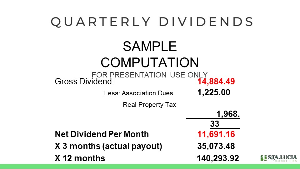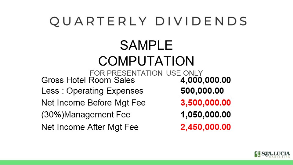 The condotel investment model at 128 Nivel Hills follows a 30:70 revenue-sharing structure, ensuring a profitable and hassle-free earning opportunity for unit owners. Under this arrangement, 30% of the total hotel revenue is allocated to Sta. Lucia Hotel Management, which oversees the daily operations, maintenance, marketing, and guest services. Meanwhile, the remaining 70% is distributed among all condotel unit investors, regardless of whether their specific unit was occupied.