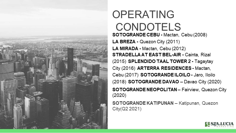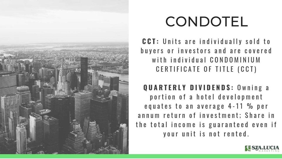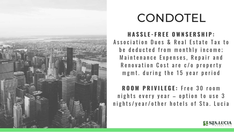 Founded in 2008, Sta. Lucia Hotel Management is a wholly-owned subsidiary of Sta. Lucia Land, Inc., specializing in the professional management and operation of premier condotels across the country. With years of experience in the hospitality and real estate industry, the company is committed to delivering seamless operations, high occupancy rates, and exceptional guest experiences, ensuring maximum profitability for investors.